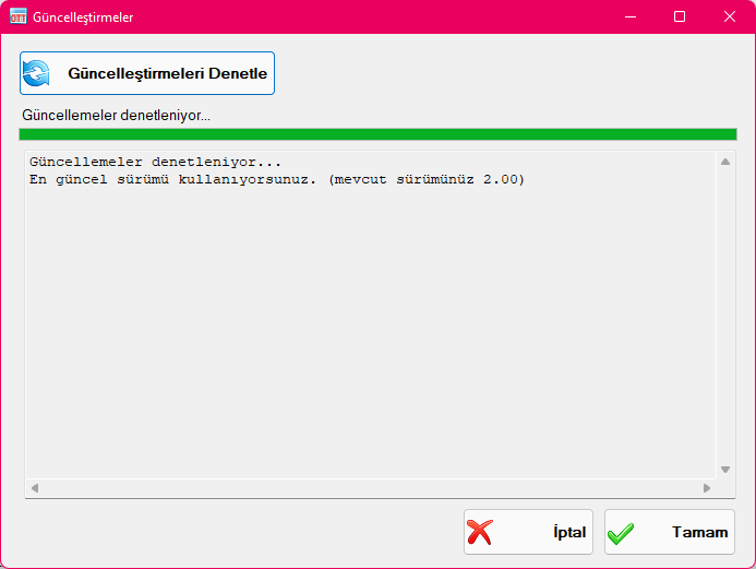 Uygulamanın yeni bir sürümünün yayınlanıp yayınlanmadığını kontrol etmek ve yeni sürüm yayınlandıysa kolayca indirip yükleyebilmek için Güncelleştirme seçeneğini kullanabilirsiniz. Eğer güncelleştirme mevcut değilse, en güncel sürümü kullandığınıza dair bir ifade listelenecektir. Eğer yeni bir sürüm yayınlanmışsa, sürüm numarası ile birlikte bu sürümdeki değişiklikler özet olarak pencerede listelenecektir. Güncelleştirmek için "Güncelleştir" butonuna tıkladığınızda yeni sürüm indirilerek uygulamanız güncelleştirilecektir.
