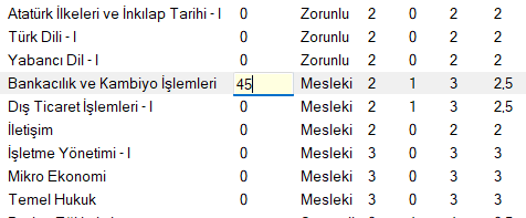 Müfredatta yer alan dersin tam adını girebilirsiniz. Eğer dersin ismi çok uzun ise, rapor çıktılarında okunablirsliği arttırmak için ugun kısaltmalar kullanabilirsiniz. Özel durumu olan dersler için, dersin ismin başına yua da sonuna özel takılar ekleyebilirsiniz. Örneğin, dönem içinde dersi açılmayıp sadece sınavı açılacak intibak derslerini diğer derslerden kolayda ayırt edebilmek için ders adının başına ya da sonuna "(İN) Bankacılıkve Kambiyo İşlemleri" ya da "Bankacılıkve Kambiyo İşlemleri (Eski)"şeklinde ibareler ekleyebilirsiniz. Bunlar çalışmayı etkilemeyecektir.