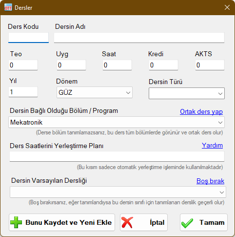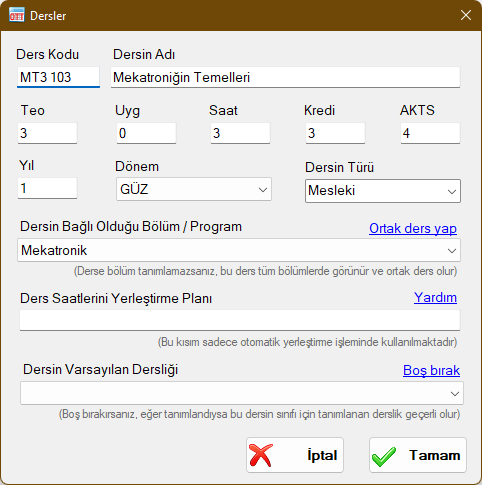 - Ders türü girilmiş olmalıdır (Listeye bağlı olmadan keyfi metin girilebilir)