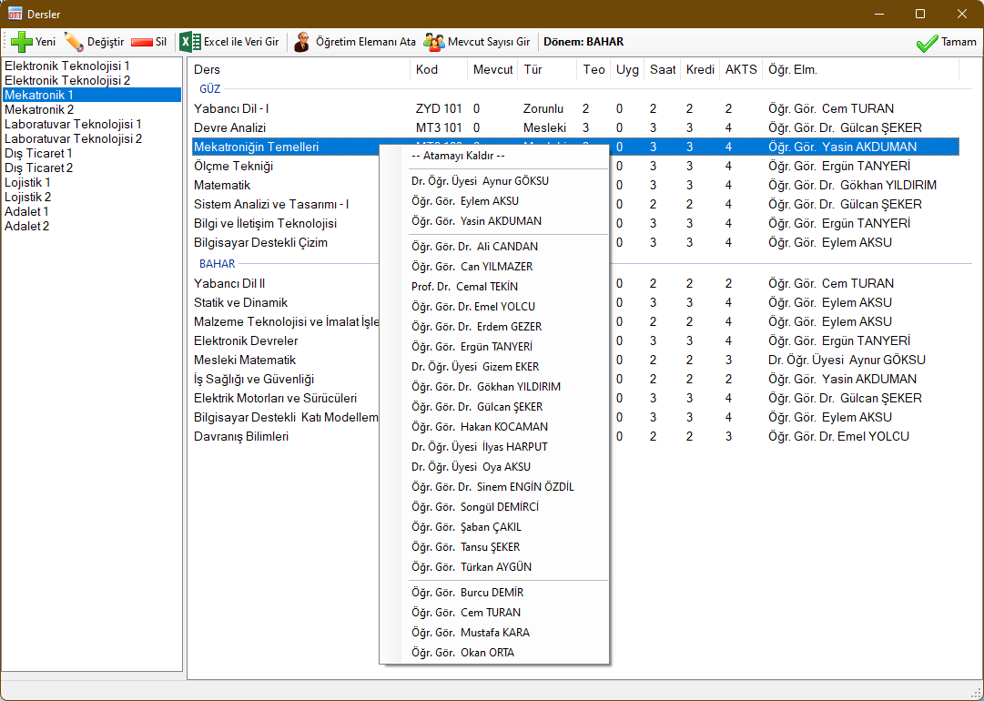 Öğretim Elemanı Ata: Listelenen derslere Öğretim Elemanı atadığınızda, artık tabloya yerleştirilebilir hale gelirler. Seçili kayda öğretim elemanı atamak için, seçili kayıt üzerinde sağ tıklamanız yeterlidir. Çıkan öğretim elemanı listesinden atamak istediğiniz Öğretim Elemanını seçiniz. Açılan sağ tık menüsünde, en üstteki "Atamayı Kaldır" seçeneği, Öğretim Elemanı atanmış bir dersi atamasını kaldırır. Menünün üst kısmındaki Öğretim Elemanı grubu, üzerinde çalıştığınız sınıfın bağlı olduğu Bölüm / Programa bağlı olan Öğretim Elemanlarını listelemektedir. Menünün alt kısmındaki grupta ise, hiç bir Bölüm / Programa bağlı olmayan Öğretim Elemanları listelenmektedir. Bu iki kategori dışındaki tüm öğretim elemanları ise menünün orta bölgesinde listelenmektedir.
