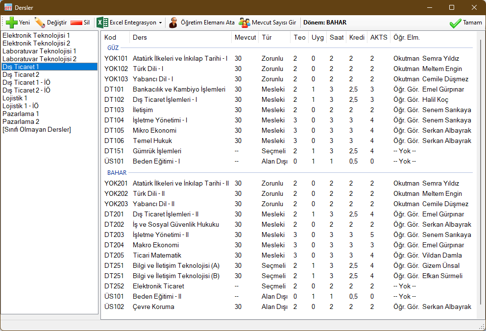 GÜZ ya da BAHAR yarıyılından biri seçilmelidir. ders hangi yarıyı için tanımlandıysa, o dönem içerisinde listelenecektir. Program hazırlamada, tablo hangi dönem için hazırlanıyorsa, sadece o döneme ait dersler listelenir. Müfredattaki ders bilgisine uygun dönem seçilmelidir.