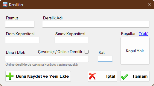 Bir dersliğin, belirli gün ve saatlerde kullanıma uygun olup olmadığını belirtmek gerekirse, dersliğe ait koşul tanımlanabilir. Koşula, program takvimi boyunca tüm gün ve saatler için uygun ya da uygun değil şeklinde tanımlama yapılmasına olanak tanır. Özellikle başka bölüm / programlarla paylaşılan dersliklerde, program takvimi içersinde belirgi bir gün ya da saatlerde bir etkinlik olması durumunda bu günlerin uygunluk durumu tanımlanabilir. Eğer bir dersliğe koşul tanımlanmış ise, uygun olmadığı gün ve saatlere bu dersliğin ataması yapılamaz.