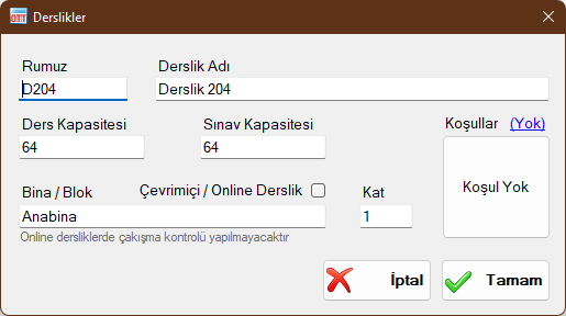 Çevrimiçi / Online yapılacak bir dersin rapor çıktılarında bu dersin Çevrimiçi / Online yapılacağını ifade edebilmek için, ismi "Çevrimiçi" ya da "Online" olan bir derslik tanımlanıp, bu seçenek işaretlenmelidir. Böylece rapor çıktılarında, bu dersliğin atandığı dersler ya da sınavların altında "Çevrimiçi" / "Online" ifadeleri görünecektir. Bu seçeneğin işaretlenmesi, derslik atamalarında Çevrimiçi dersliklerin çalkışma kontrollerine tabi tutulmamalarını sağlar. Böylece Çevrimiçi derslikler aynı gün ve saate herhangi çakışma uyarısı alınmaksızın atanabilir.