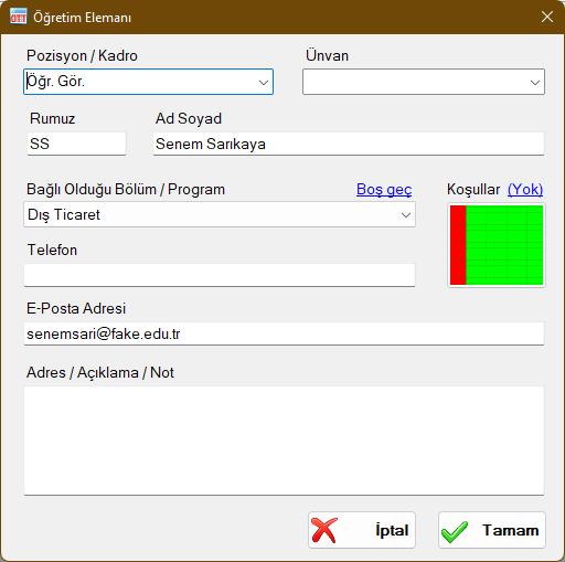 Koşul, bir öğretim elemanının, hazırlanan program için hangi gün ve saatlerde uygun ve hangi gün ve saatlerde uygun olmadığını belirtir. Eğer koşul tanımlanırsa, günü gün ve saat saat uygunluk durumları belirlenir. Program hazırlarken, öğretim elemanının derslerinin ya da sınavlarının uygun olmadığı gün ve saatlere yerleştirilmelerine müsaade edilmez. Koşullar, özellikle başka birimden ya da dışarıdan derse giren ve sadece haftanın belirli günleri gelebilecek öğretim elemanları için yararlı bir özelliktir. Böylece, yanlışlıkla öğretim elemanının uygun olmadığu gün ve saate ders ya da sınav yerleştirilmesi mümkün olmaz. Koşul tanımalam ile ilgili deyatlı bilgiler Koşular konusunda anlatılmıştır.