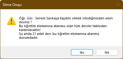 Sil: Seçili Öğretim Elemanını silmek için kullanılmaktadır. Eğer silemk istediğiniz Öğretim Elemanına bağlı atanmış dersler varsa, bunların atamalarının kaldırılacağını ifade eden bir uyarı çıkacaktır. Mesaj kutusunu onayladığınızda seçili öğretim elemanı silinecek ve bu öğretim elemanının ders atamaları kaldırılacaktır.