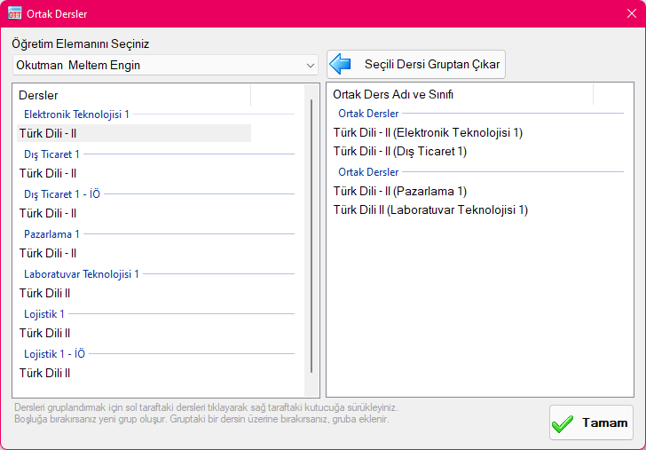 Bu pencerede, öncelikle, ortak dersi verecek Öğretim Elemanını seçmeniz gerekmektedir. Öğretim elemanını seçtiğinizde, bu Öğretim Elemanının vermekte olduğu dersler ve sınıfları listelenir. Hangi dersleri ortak yapmak istiyorsanız, o dersleri fare ile tutup sağ taraftaki kutucuğa bırakmanız gerekir. Sağ taraftaki kutucukta boşluğa bırakılan her bir ders yeni bir grup oluşturur. Eğer bir dersi, herhangi gruptaki başka bir dersin üzerine bırakırsanız, o dersleri gruplandırılarak Ortak Ders olurlar.