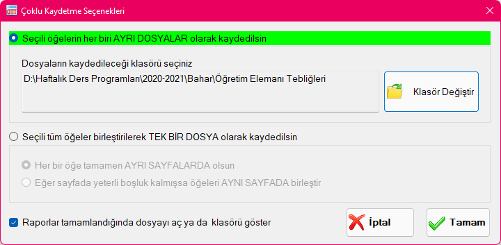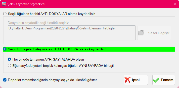 - Seçili tüm öğeler birleştirilerek TEK BİR DOSYA olarak kaydedilsin: Bu seçeneği seçtiğinizde, seçmiş olduğunuz tüm öğeler, tek bir dosya içerisinde sayfalar halinde birleştirilecektir. Bu seçeneği seçtiğinizde iki alt seçenek karşınıza çıkar. Eğer her bir öğenin dosya içerisinde yeni bir sayfadan başlamasını isterseniz "Her bir öğe tamamen AYRI SAYFALARDA olsun" seçeneğini seçebilirsiniz. "Eğer sayfada yeterli boşluk kalmışsa öğeleri AYNI SAYFADA birleştir" seçeneği ise, özellikle Öğretim Elemanı Der Yükü tablosu gibi küçük boyutlu tabloların yazdırılmasında sayfadan tasarruf sağlar. Küçük boyutlu tablolar sığdığı kadarıyla aynı sayfaya yazdırılır, sayfa dolduğunda diğer sayfaya geçilir. Bu seçenek her dosya türü için geçerli olmayabilir. Diyalog penceresini onayladığınızda, seçmiş olduğunuz tüm öğeler, seçmiş olduğunuz dosya formatında tek bir dosya şeklinde kaydedilecektir.