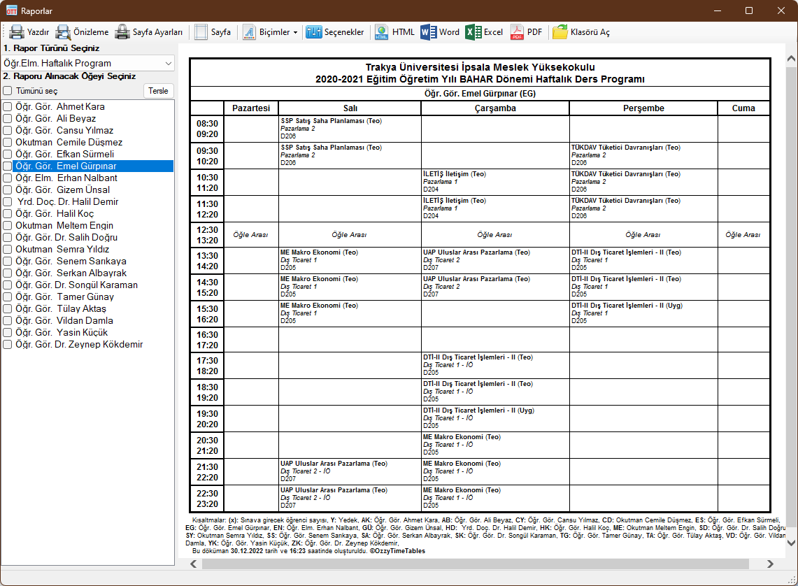 Haftalık Ders programı ya da Sınav Takvimi hazırlama işlemi tamamlandıktan sonra bu programların ilgililere tebliğ edilmesi ve öğrencilere ilan edilmesi gerekecektir. Rapor çıktıları üretmek için Rapor ve Çıktılar penceresi kullanılmaktadır. Bu pencerede, öncelikle almak istediğiniz rapor türünü seçnemiz gerekmektedir. Rapor türleri, Haftalık Ders Programı ya da Sınav Programı olması durumuna göre değişecektir. Rapor türü seçildiğinde, eğer rapor için öğeler seçilmesi gerekiyorsa bu öğeler liste kutusunda listelenecektir. Listeden seçeneğiniz öğe için rapor önizleme penceresinde gösterilecektir. Toplu rapor çıktısı almak için, raporlarını almak istediğiniz öğelerin seçim kutucuklarını işaretleyebilirsiniz.