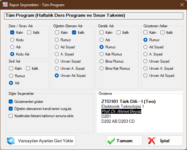 Rapor seçenekleri, rapor çıktılarında ders/sınav, öğretim elemanı, sınıf, derslik ve gözetmen adlarının ne şekilde görüntüleneceğinin seçilebilceği bir ayar penceresidir. Bu ayar penceresinde, her bir rapora özel ayarlamalar yapılmaktar. Ayar yapılan rapor adı pencerenin üst kısmındaki kutucukta yazmaktadır. Her bir rapor ayarları birbirinden bağımsız olup, bir rapor çıktısı için yapmış olduğunuz ayarlama diğerlerini etkilememektedir. Yapılan ayarlar bilgisayarınıza kaydedilmekte ve sonraki rapor çıktılarında bu tercihler kullanmaya devam edilebilmektedir.