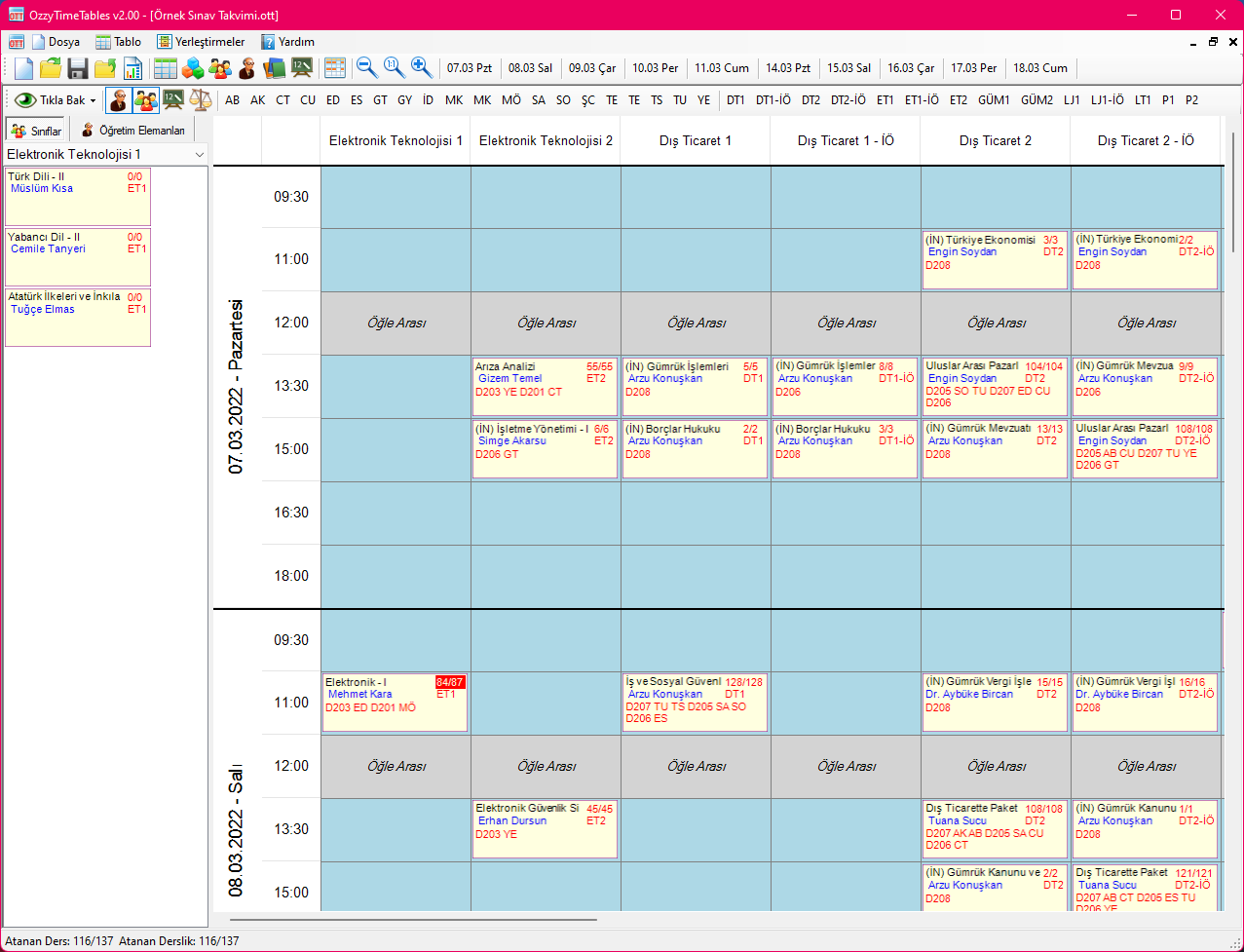 Sınav programı hazırlanması, pencerenin sol kenarındaki ders listesindeki derslerin tek tek alınarak tabloda uygun hücrelere yerleştirilmesidir. Sol kenardaki dersler iki şekilde listelenmektedir;