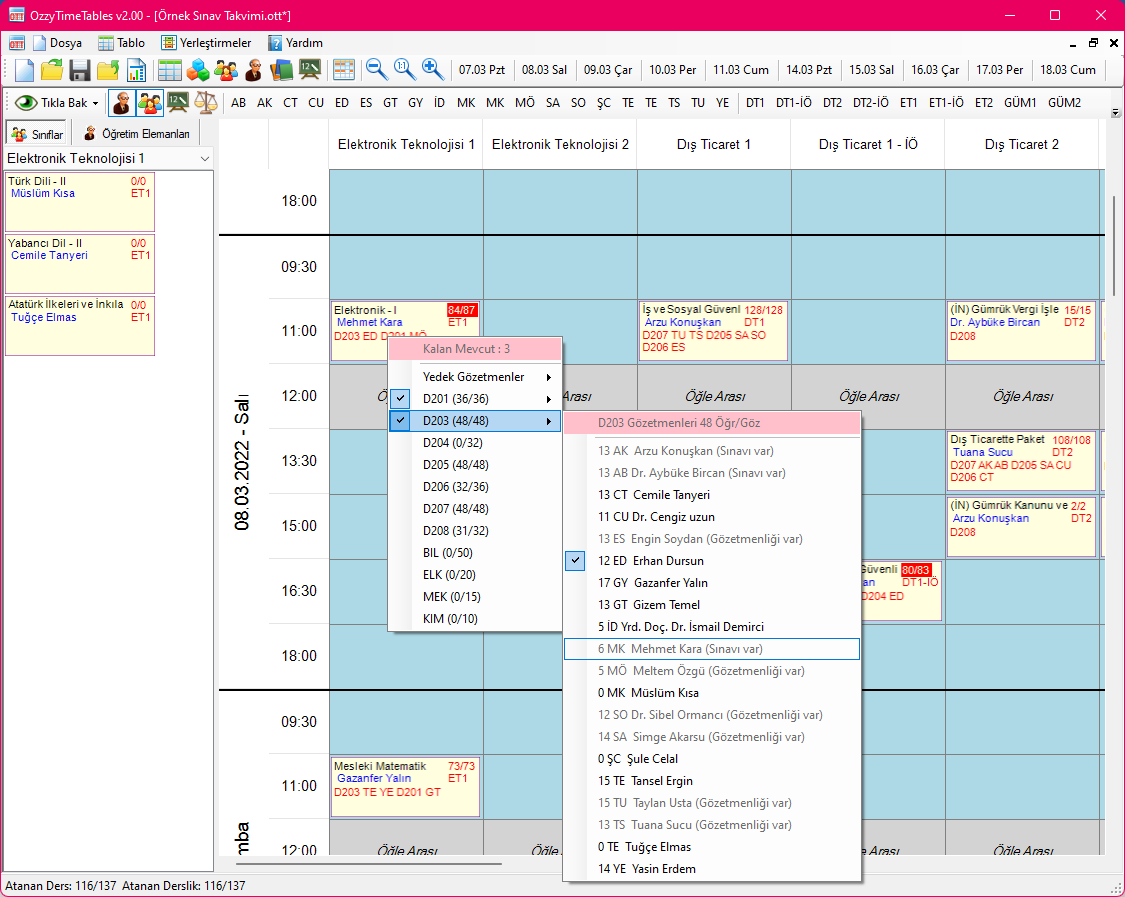 Tüm yerleştirme işlemi tamamlandıktan sonra sınavlara dersliklerin atanması gerekir. Sınavlara birden fazla derslik ve her bir dersliğe birden fazla gözetmen atayabilirsiniz. Sınavlara derslik atamak için sınavın üzerine sağ tıklamanız yeterlidir. Sağ tıkladığınızda dersliklerin listesi açılır. Burada dersliklerin Rumuzları ile birlikte, dersliğin o saatte kullanımda olup olmadığı, dersliğe atanan öğrenci sayısı / dersliğin sınav kapasitesi bilgisi görünür. Bir dersliğe tıklayıp seçtiğinizde, o dersliğe atayabileceğiniz gözetmenlerin listesi bir alt menüde gösterilir. İsterseniz atadığınız dersliğe hemen bir gözetmen atayabilir, ya da gözetmenleri daha sonra ayrıca atayabilirsiniz.